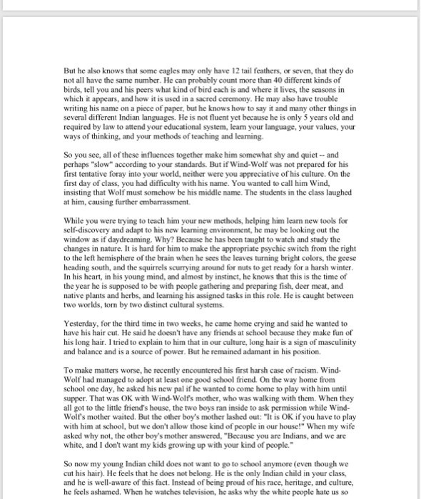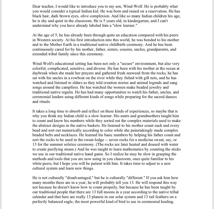 Dear Teacher I would like to introduce you to my son Wind-Wolf. That American Indians are better than white men O D. He has lots of trouble making friends and if he does make friends other children s parents do not give their kids permission to.