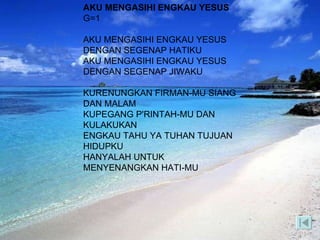 Aku Mengasihi Engkau Yesus Aku mengasihi Engkau YesusDengan segenap hatikuAku mengasihi Engkau YesusDengan segenap jiwakuK. AKU MENGASIHI ENGKAU YESUS. G G Bm C G Aku Mengasihi Engkau Yesus C D G D dengan segenap hatiku G Bm C G Aku Mengasihi Engkau Yesus C D G D dengan segenap jiwaku Reff.